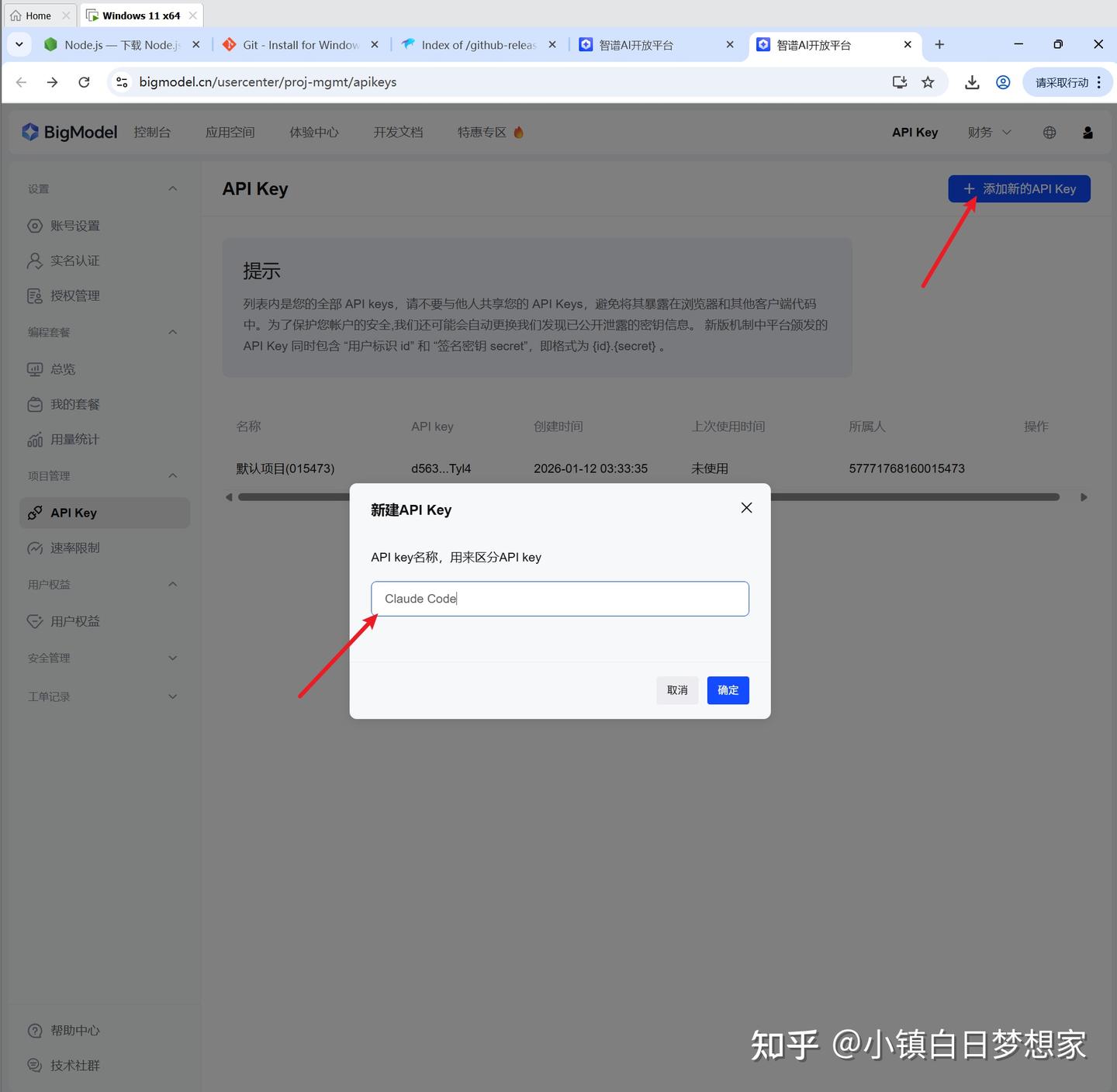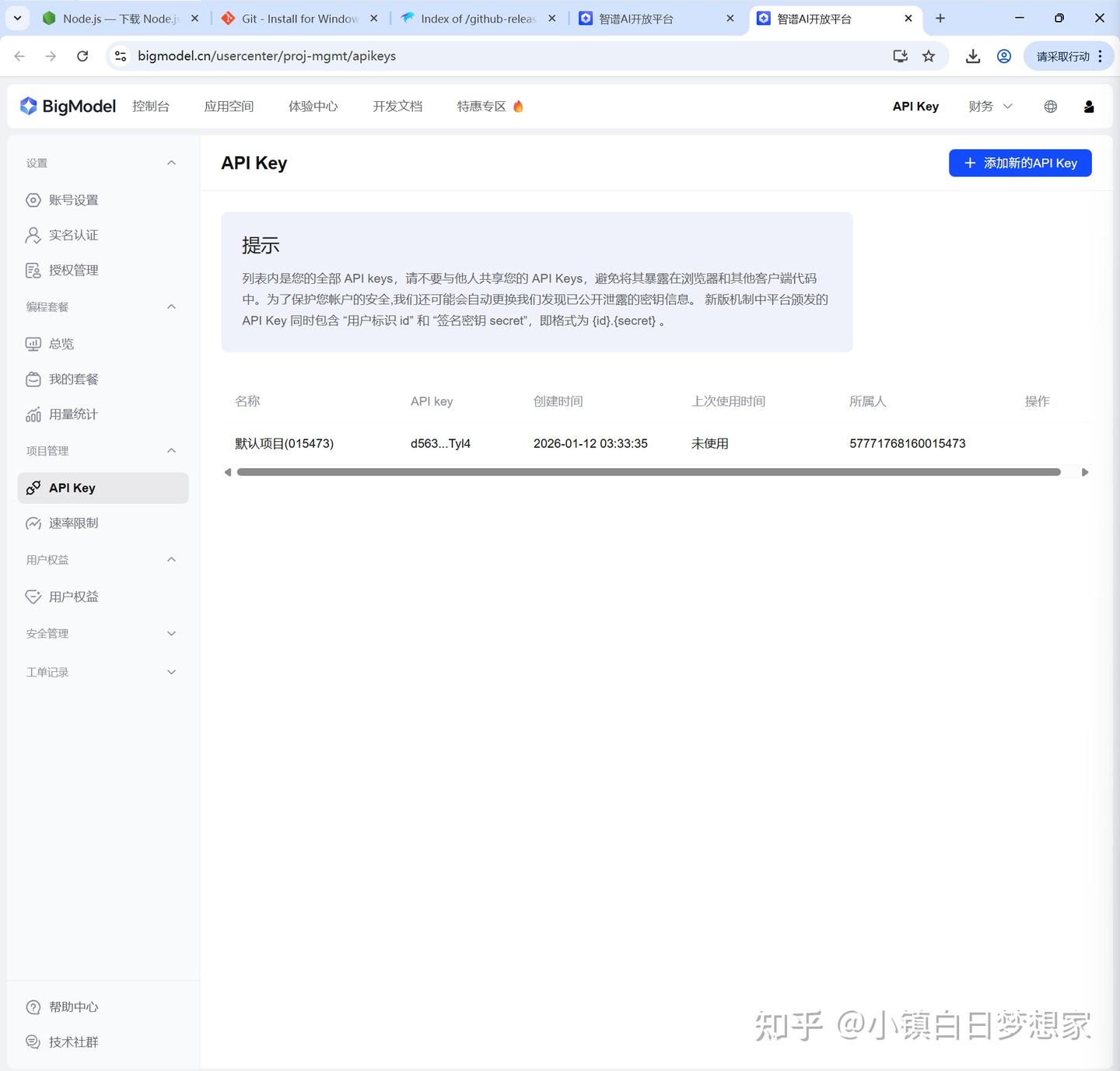 登录后,在个人中心页面,点击 API Keys,创建一个新的 API Key。